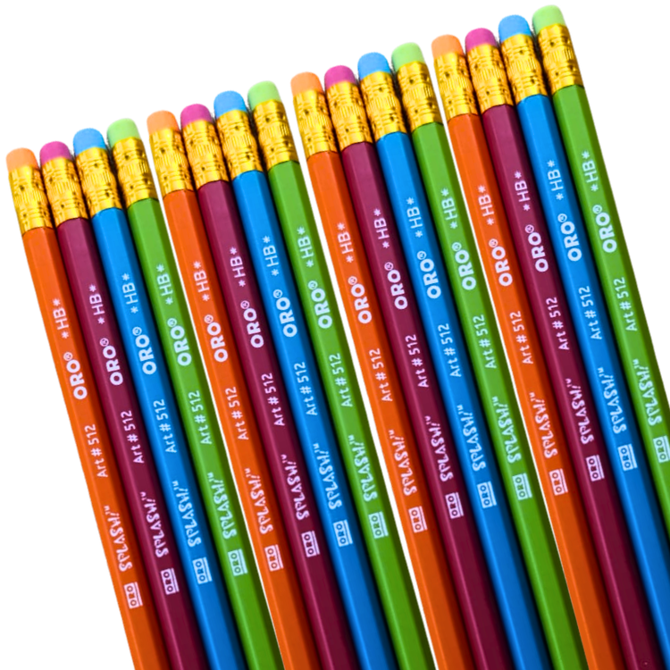ORO Splash Multicolor Lead Pencils with Matching Erasers — Pack of 12. Vibrant colorful barrels, smooth dark lead & fun matching erasers. Perfect for school kids & daily writing.